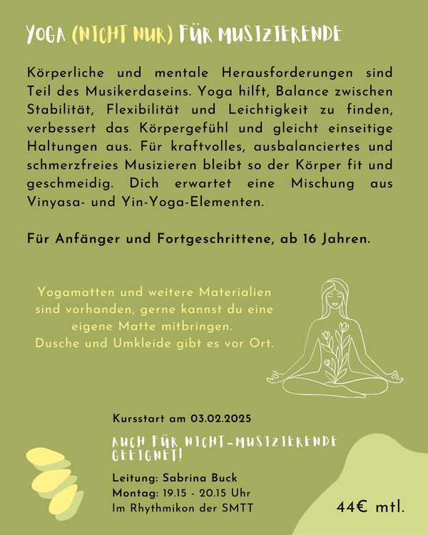 Körperliche und mentale Herausforderungen sind Teil des Musikerdaseins. Yoga hilft, Balance zwischen Stabilität, Flexibilität und Leichtigkeit zu finden, verbessert das Körpergefühl und gleicht einseitige Haltungen aus. Für kraftvolles, ausbalanciertes und schmerzfreies Musizieren bleibt so der Körper fit und geschmeidig. Dich erwartet eine Mischung aus Vinyasa- und Yin-Yoga-Elementen.
